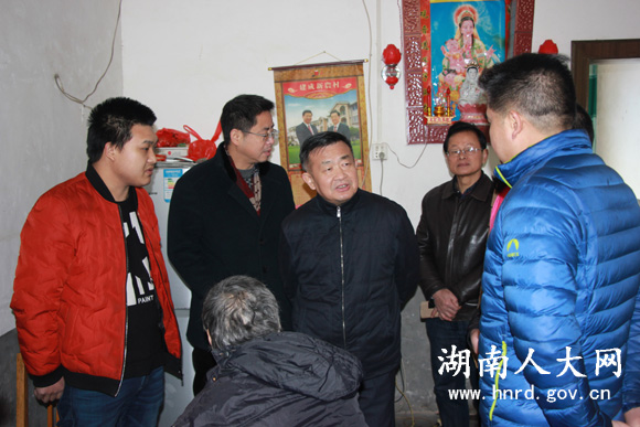 2月5日,省人大常委会原副主任谢勇同志(左一)一行深入茶陵县虎踞镇水源村调研指导扶贫工作并慰问了部分贫困户。