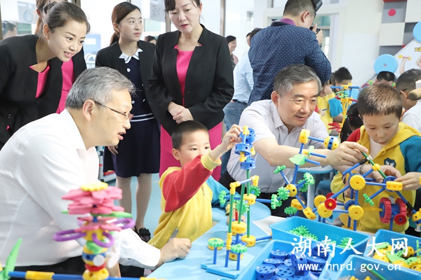 桃阳英蓝幼儿园是长沙市一级普惠性幼儿园,主要是为桃阳村及周边居民提供公平、有质量的学前教育。王柯敏来到孩子们中间,与孩子们一起玩拼装、制作环保作品等。他说,孩子是家庭的希望、祖国的未来。学前教育必须遵循少儿的成长特点和规律,释放出更多的空间和时间,让孩子们拥有更多快乐的时光,在快乐中健康成长。