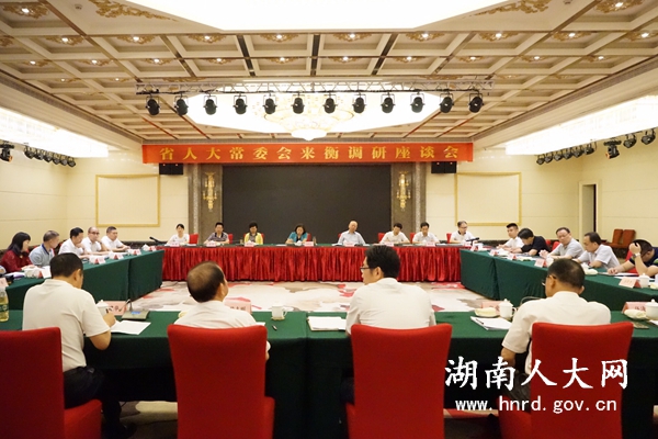 省人大常委会秘书长胡伯俊主持座谈会。省人大常委会联工委主任张云英,省人大常委会研究室副主任王向前等参加调研。