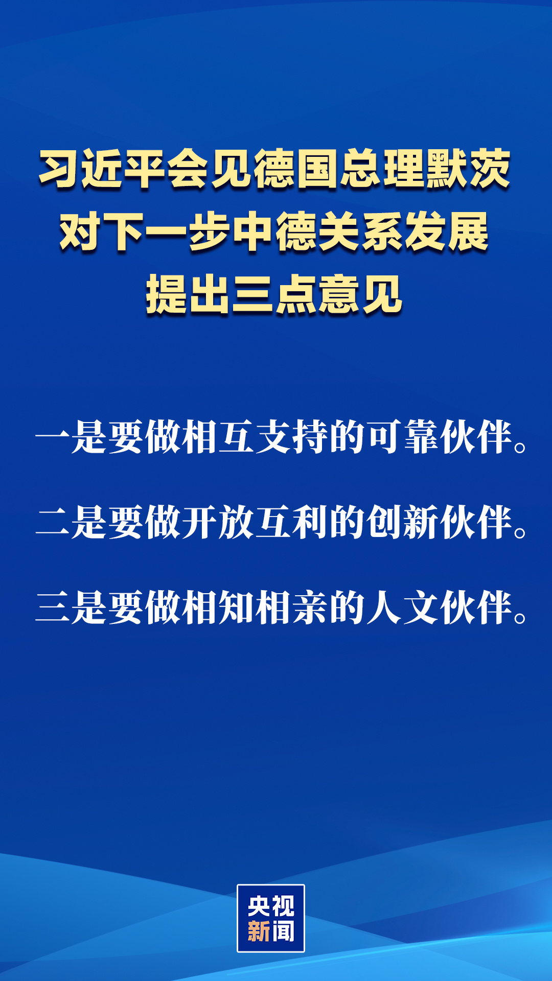 习近平对下一步中德关系发展提出三点意见。一是要做相互支持的可靠伙伴。中德两国都立足自身、快速发展,坚持互尊互信、开放合作,书写了互利共赢的成功故事。中国坚持和平发展道路,有能力和底气实现中国式现代化,将继续同包括德国在内的世界各国分享发展机遇。希望德方客观理性看待中国发展,奉行积极、务实的对华政策,同中方一道推动中德关系行稳致远。