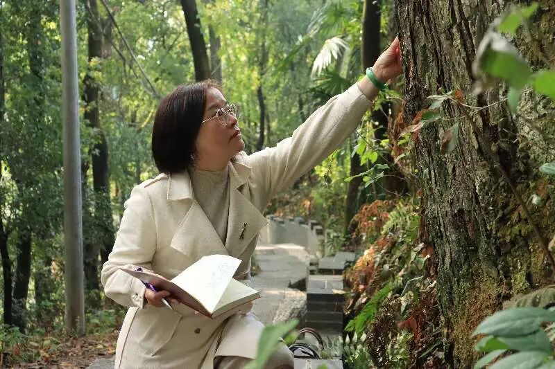 汨罗市人大代表周霞调研中查看名木古树保护情况。